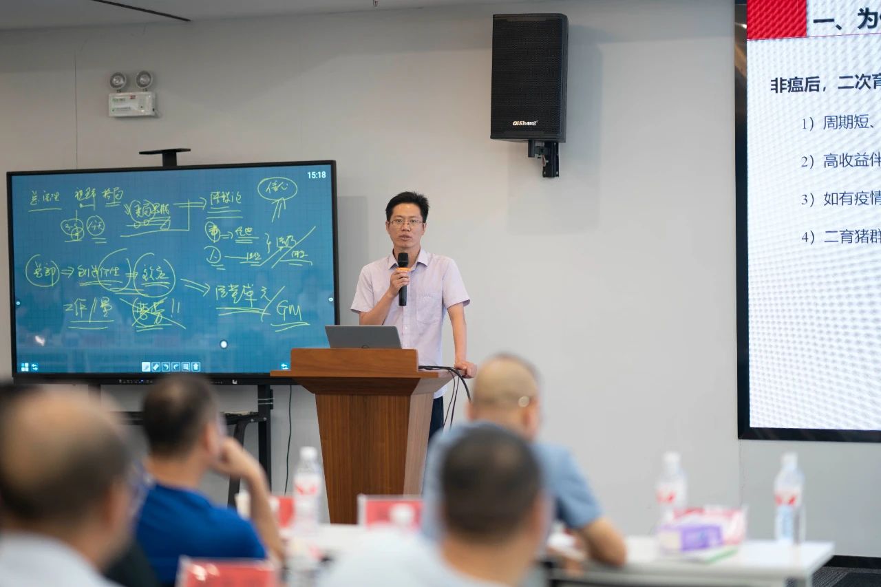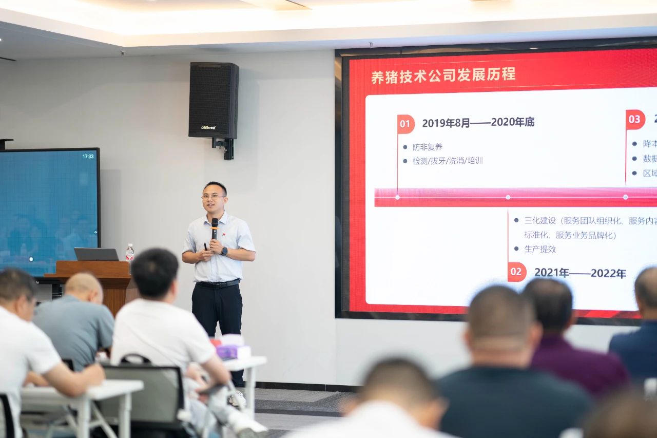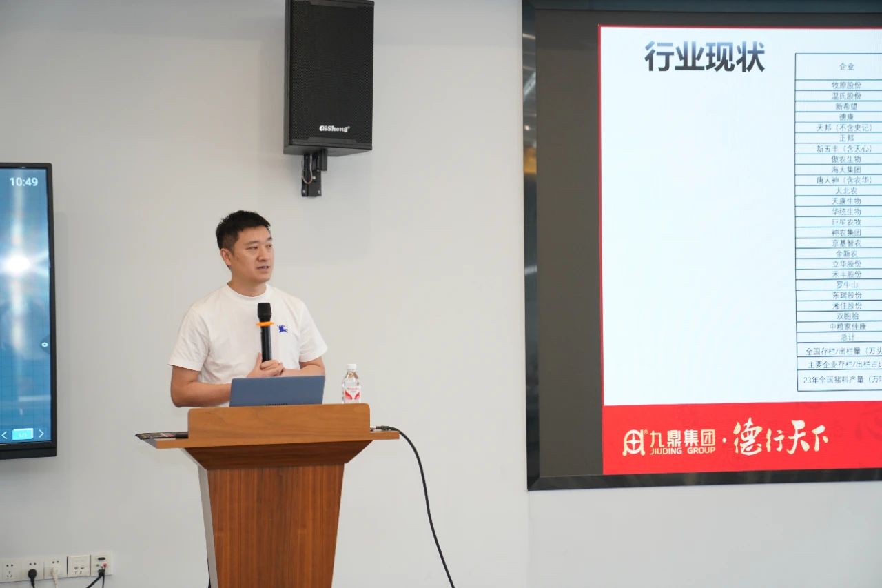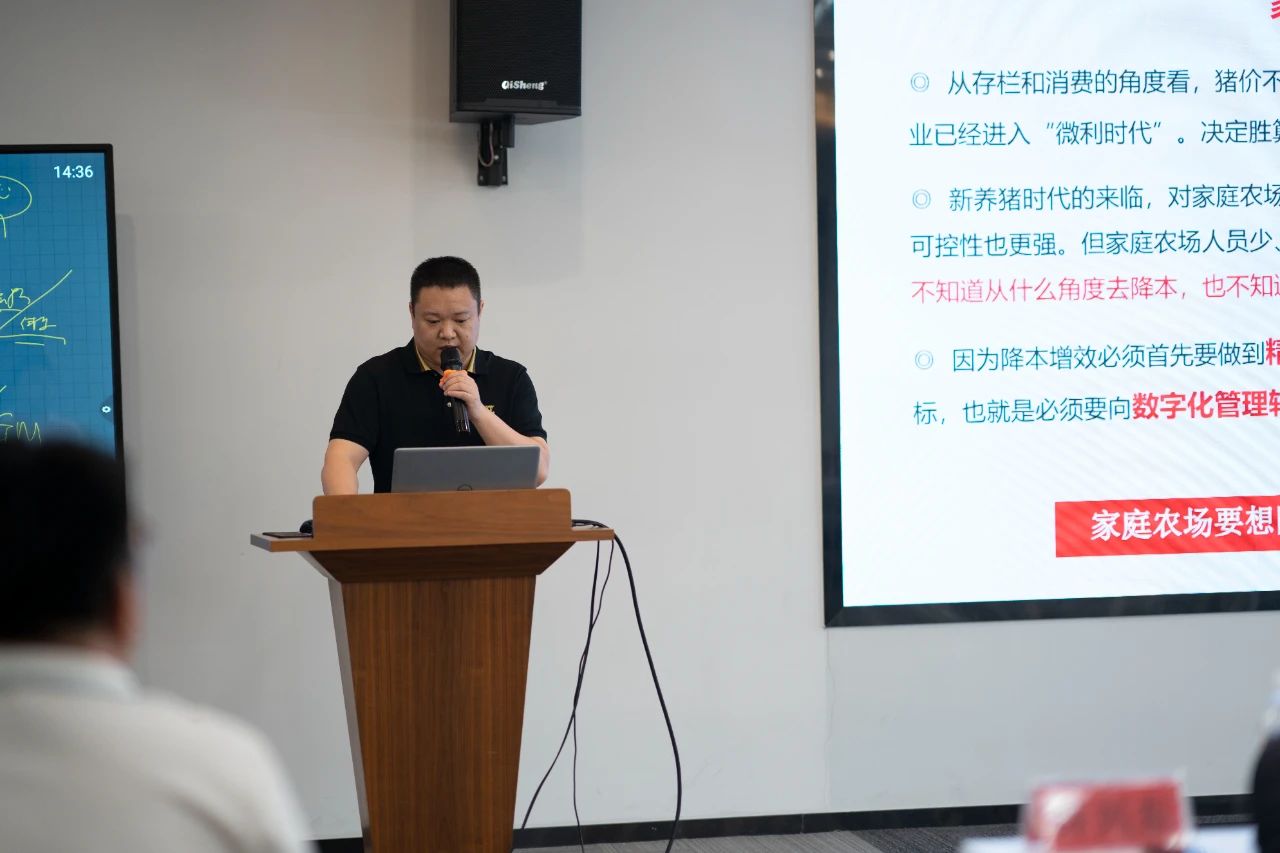▲集團(tuán)研發(fā)中心總經(jīng)理江書(shū)忠介紹了《家庭農(nóng)場(chǎng)養(yǎng)豬E平臺(tái)》和《通過(guò)體況管理提升母豬生產(chǎn)成績(jī)》