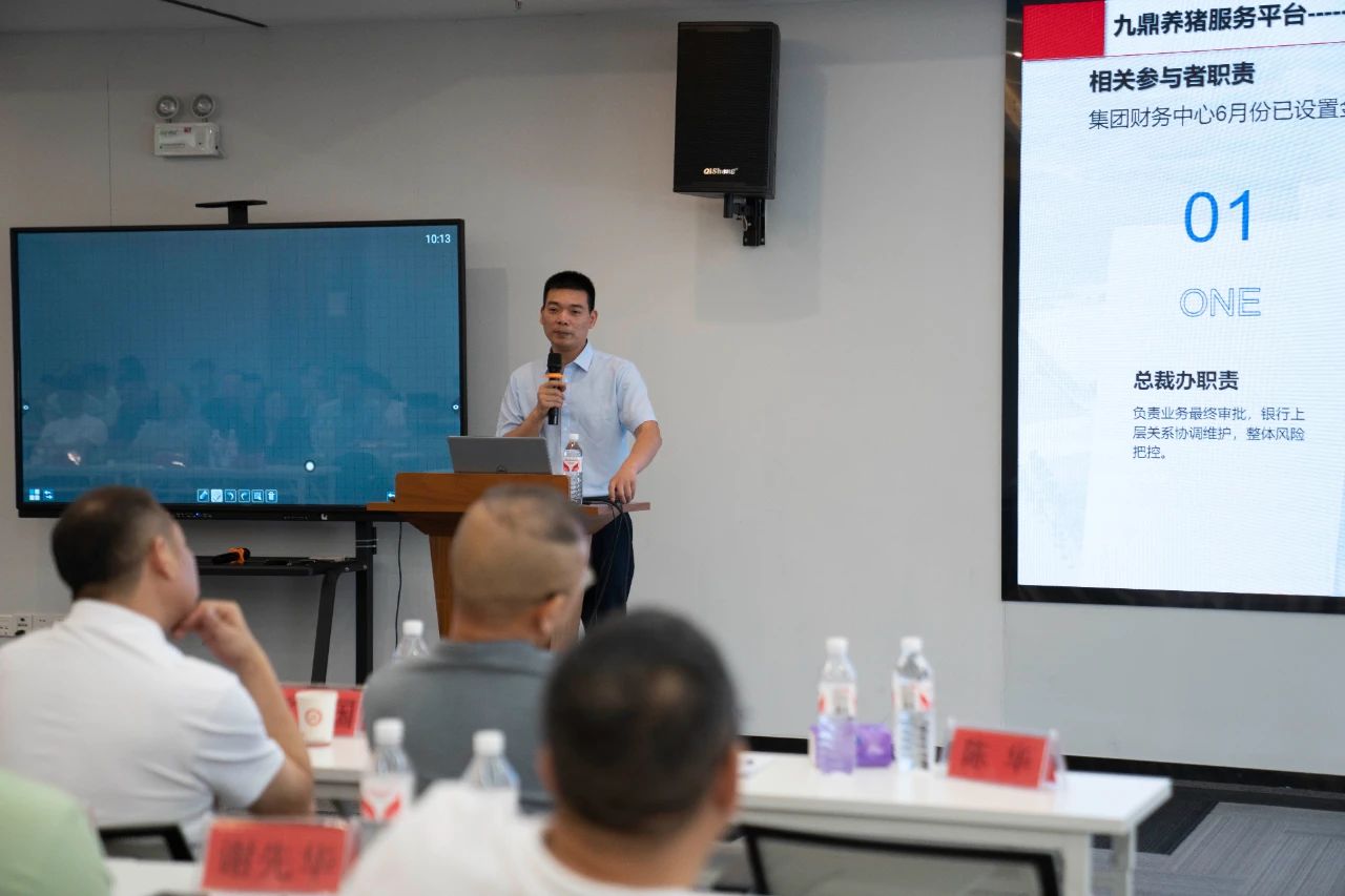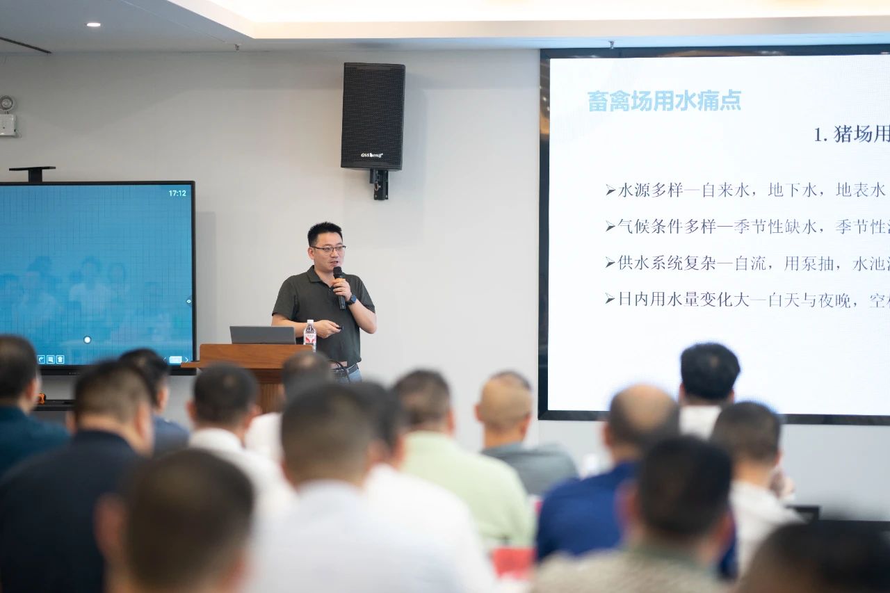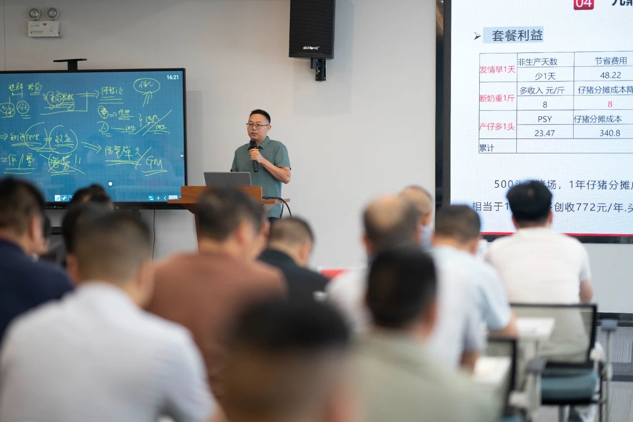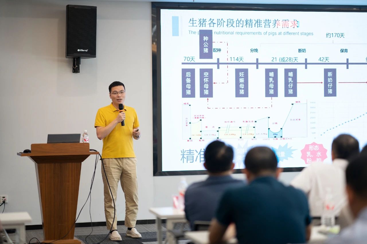 ▲集團(tuán)研發(fā)中心總經(jīng)理江書(shū)忠介紹了《家庭農(nóng)場(chǎng)養(yǎng)豬E平臺(tái)》和《通過(guò)體況管理提升母豬生產(chǎn)成績(jī)》