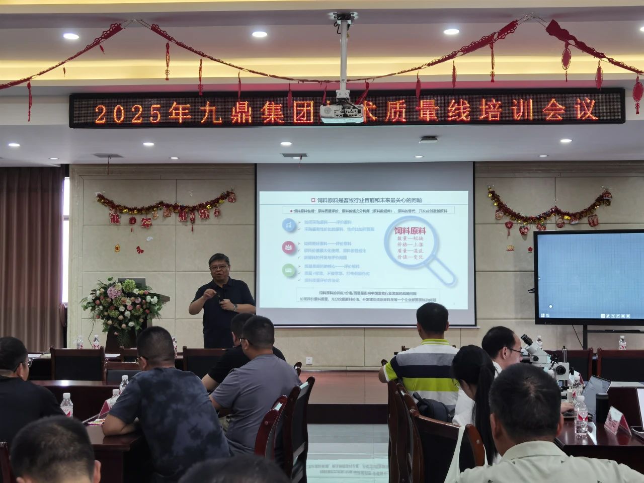 2025年7月22日至23日,九鼎集團(tuán)在岳陽(yáng)基地湖南農(nóng)牧成功組織召開(kāi)技術(shù)質(zhì)量線專(zhuān)題培訓(xùn)會(huì)議。本次會(huì)議特邀飼料行業(yè)資深專(zhuān)家、青島蔚藍(lán)生物股份有限公司動(dòng)物營(yíng)養(yǎng)首席科學(xué)家郭吉原老師及其團(tuán)隊(duì)現(xiàn)場(chǎng)授課指導(dǎo),集團(tuán)技術(shù)、質(zhì)量、采購(gòu)三線近 80 名骨干人員齊聚一堂,共同參與這場(chǎng)聚焦質(zhì)量管理升級(jí)的專(zhuān)業(yè)培訓(xùn)。